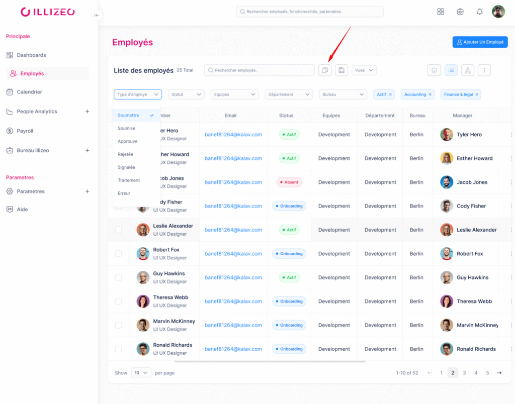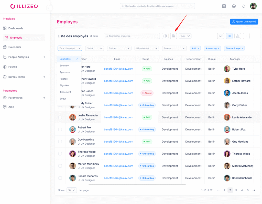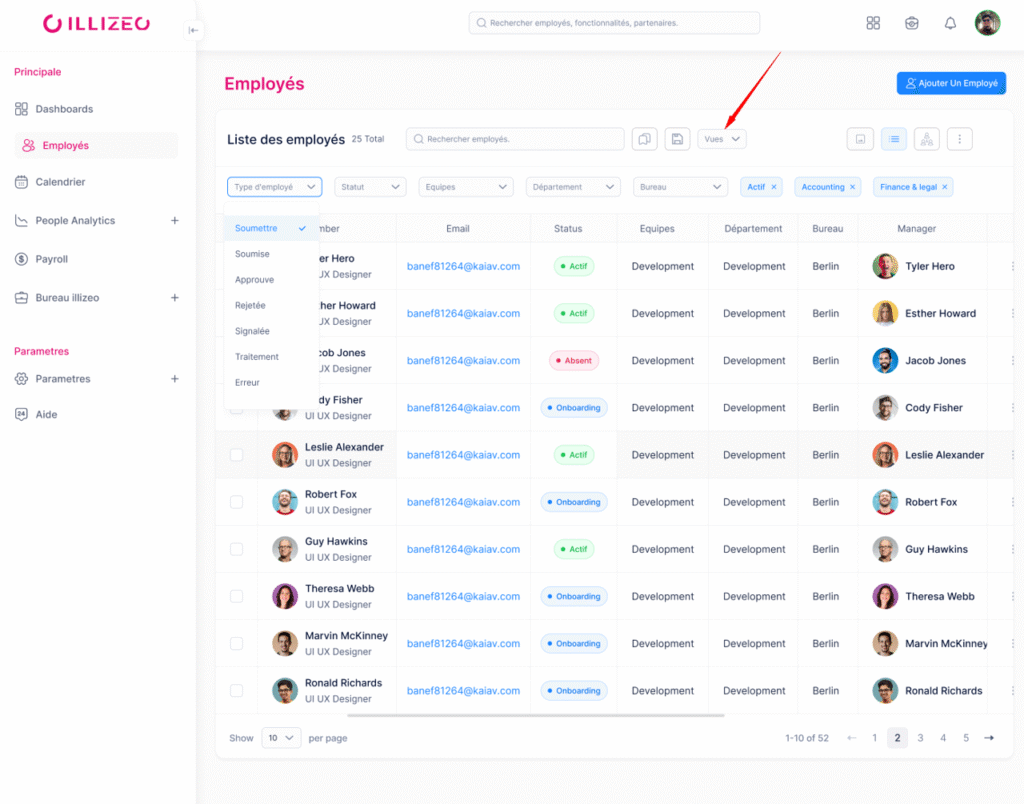 Voici une description de la page Liste des employés sur Illizeo et des options liées aux vues :