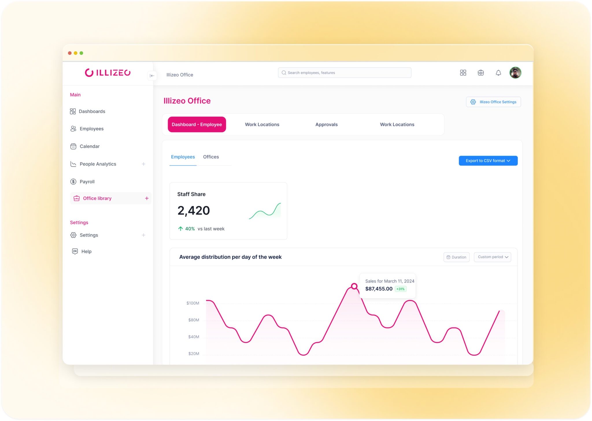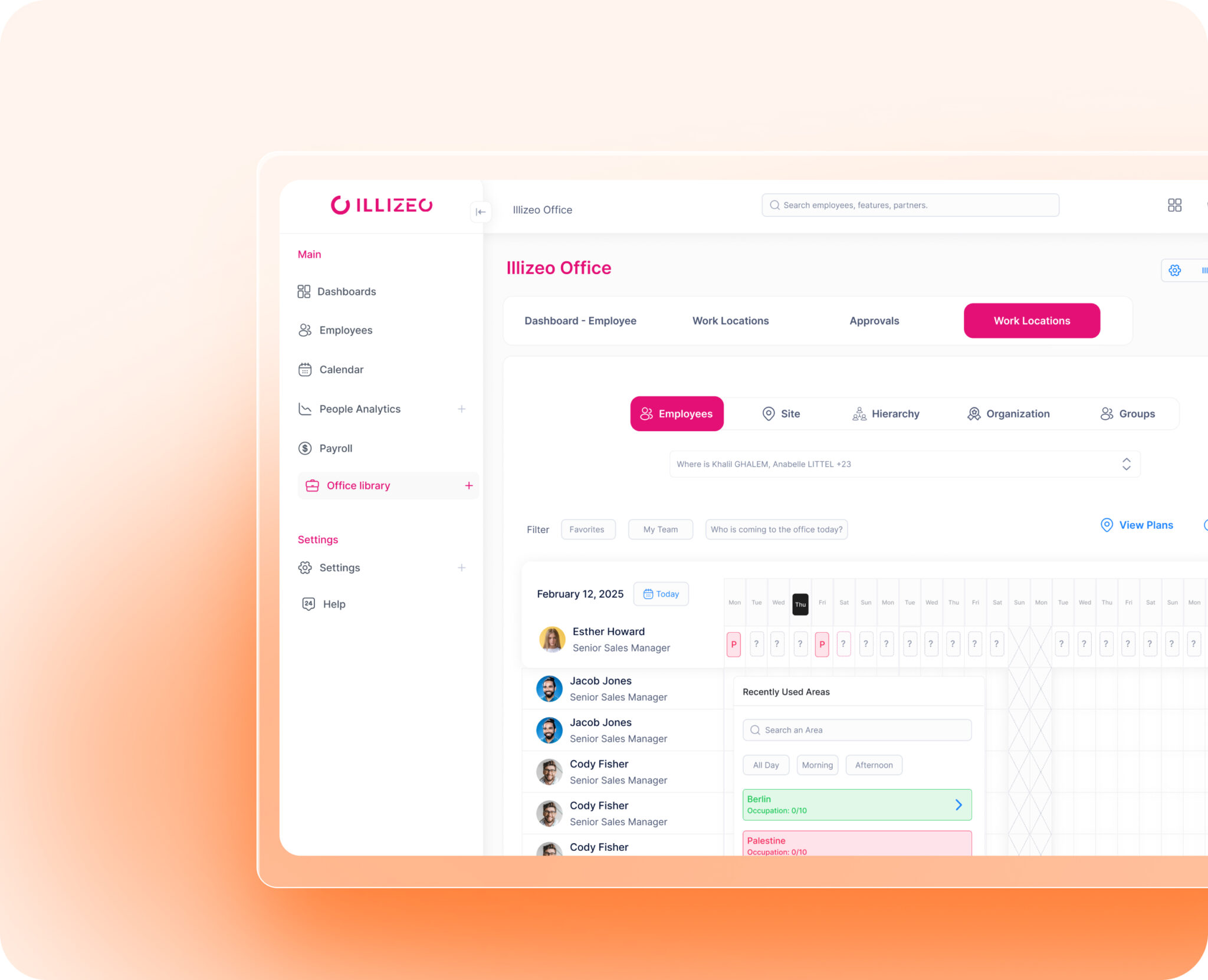 With flex office and hybrid working, rethinking your spaces is becoming essential. Illizeo Flex Office helps you optimize your premises by carefully managing the capacity of each site and automatically regulating attendance according to your constraints.