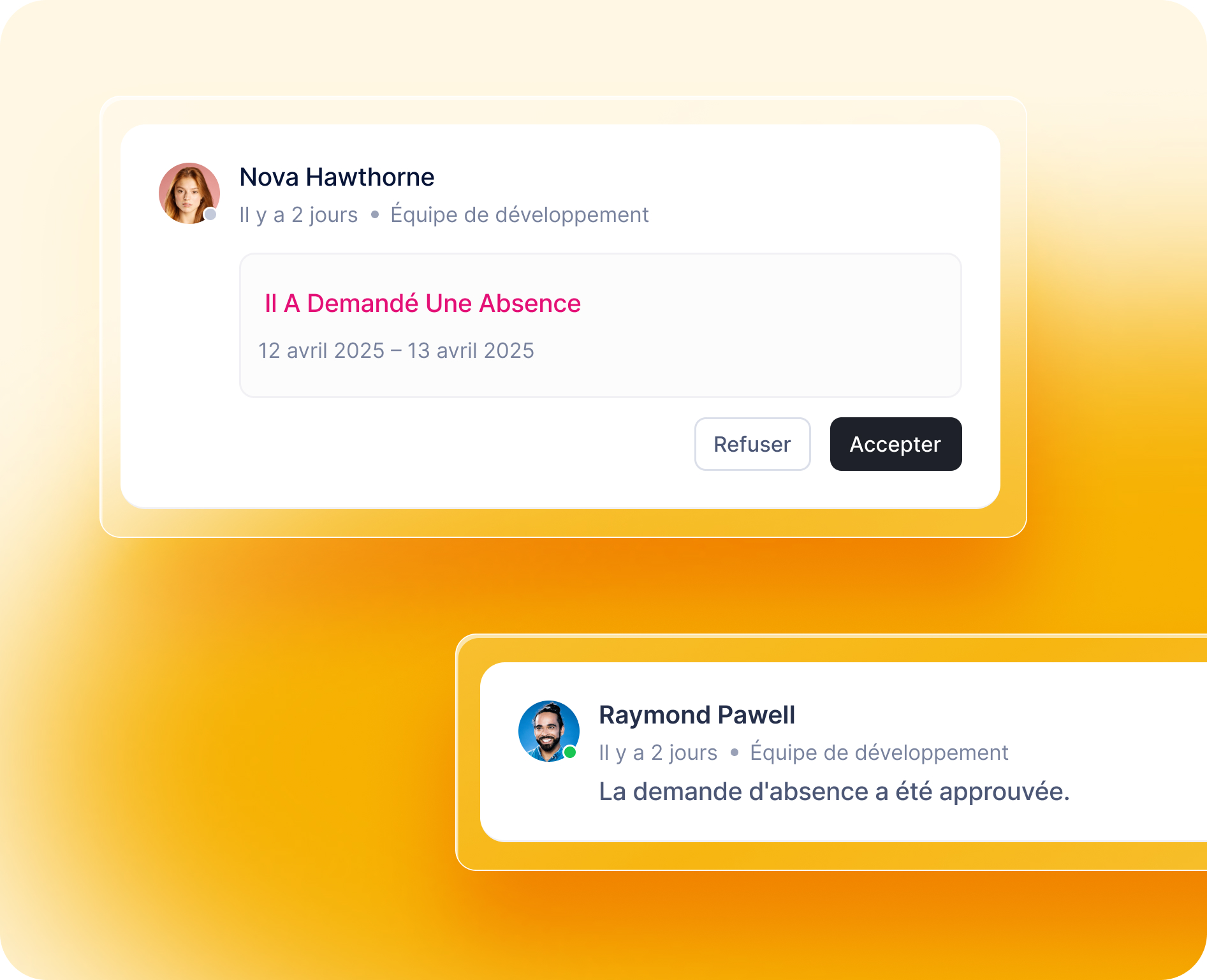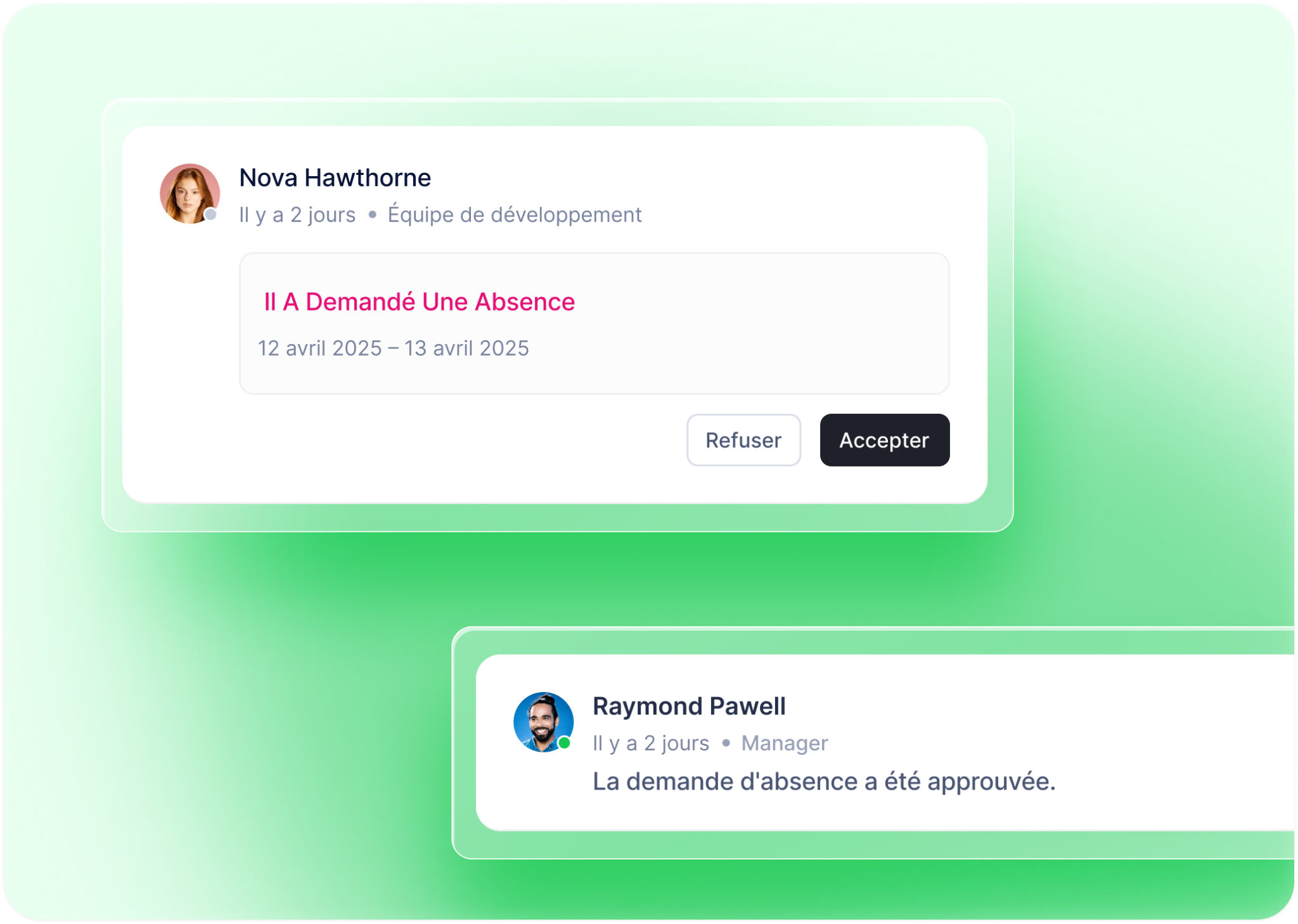 Manager/RH : approuve en un clic, visualise l’impact équipe, déclenche un remplaçant, est alerté en cas de conflit.