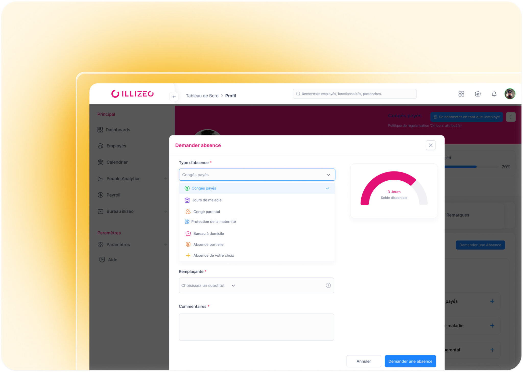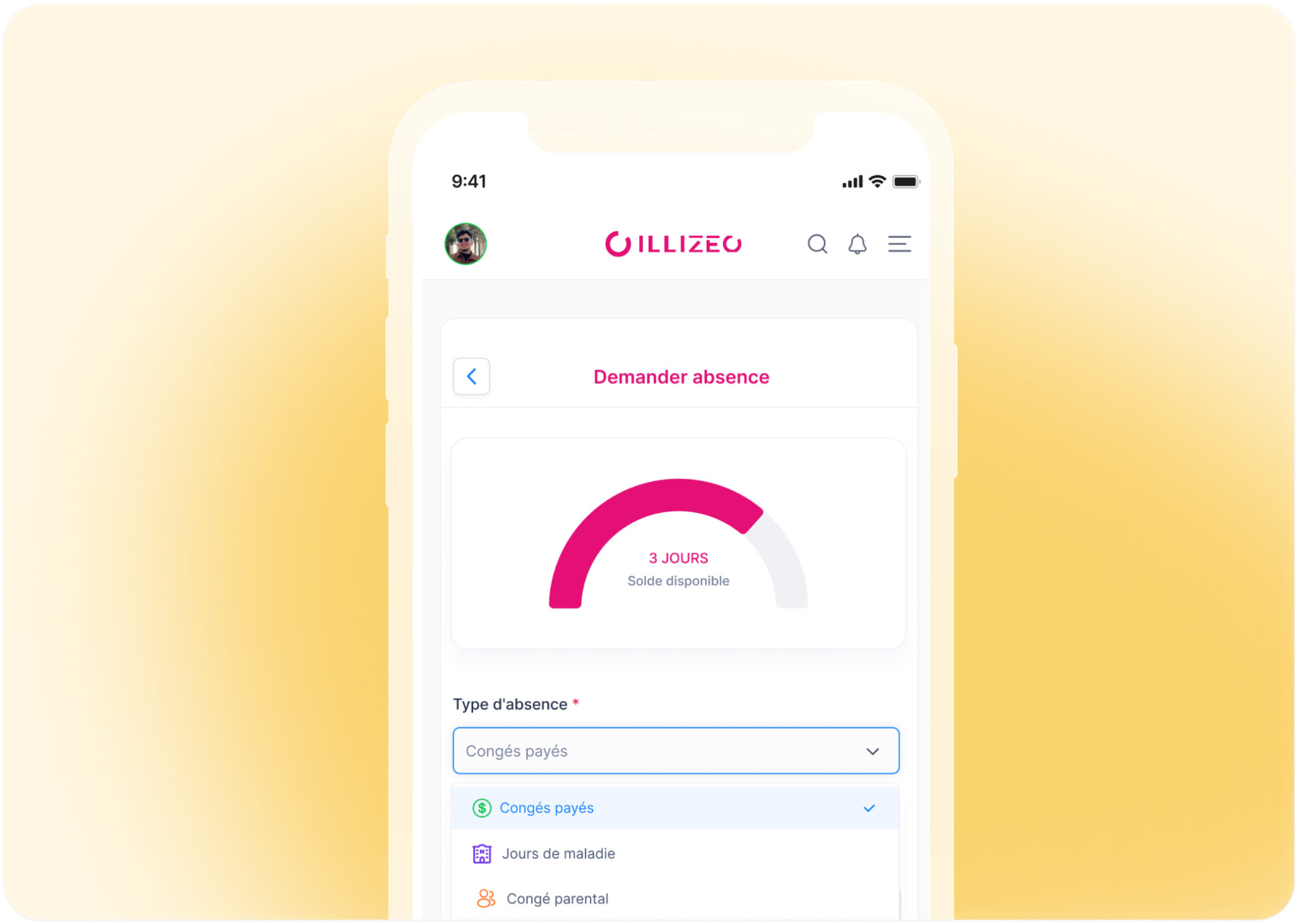 demande d’absence en 3 clics, justificatifs, visualisation du solde restant.