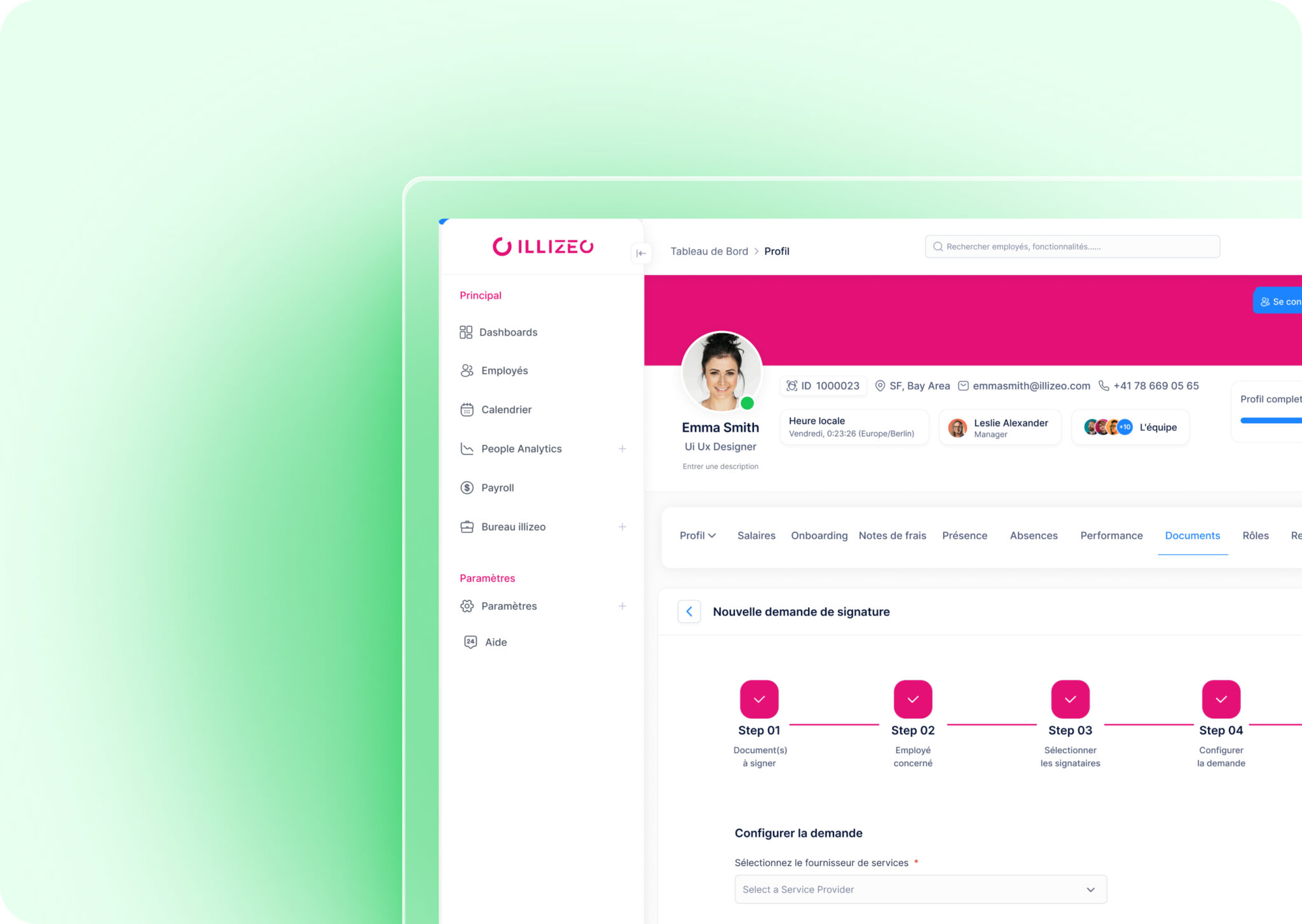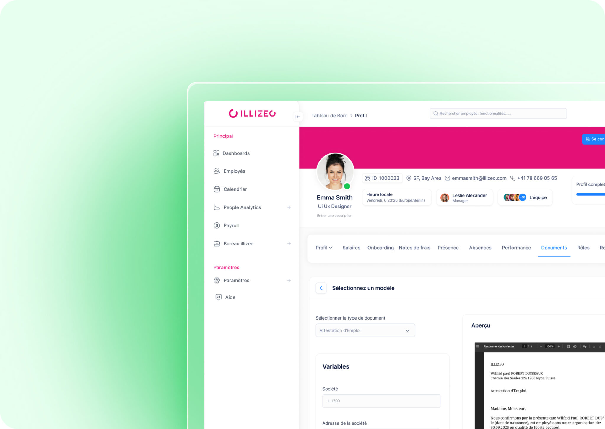 Illizeo insère automatiquement les informations collaborateur depuis le SIRH (nom, poste, rémunération, etc.).